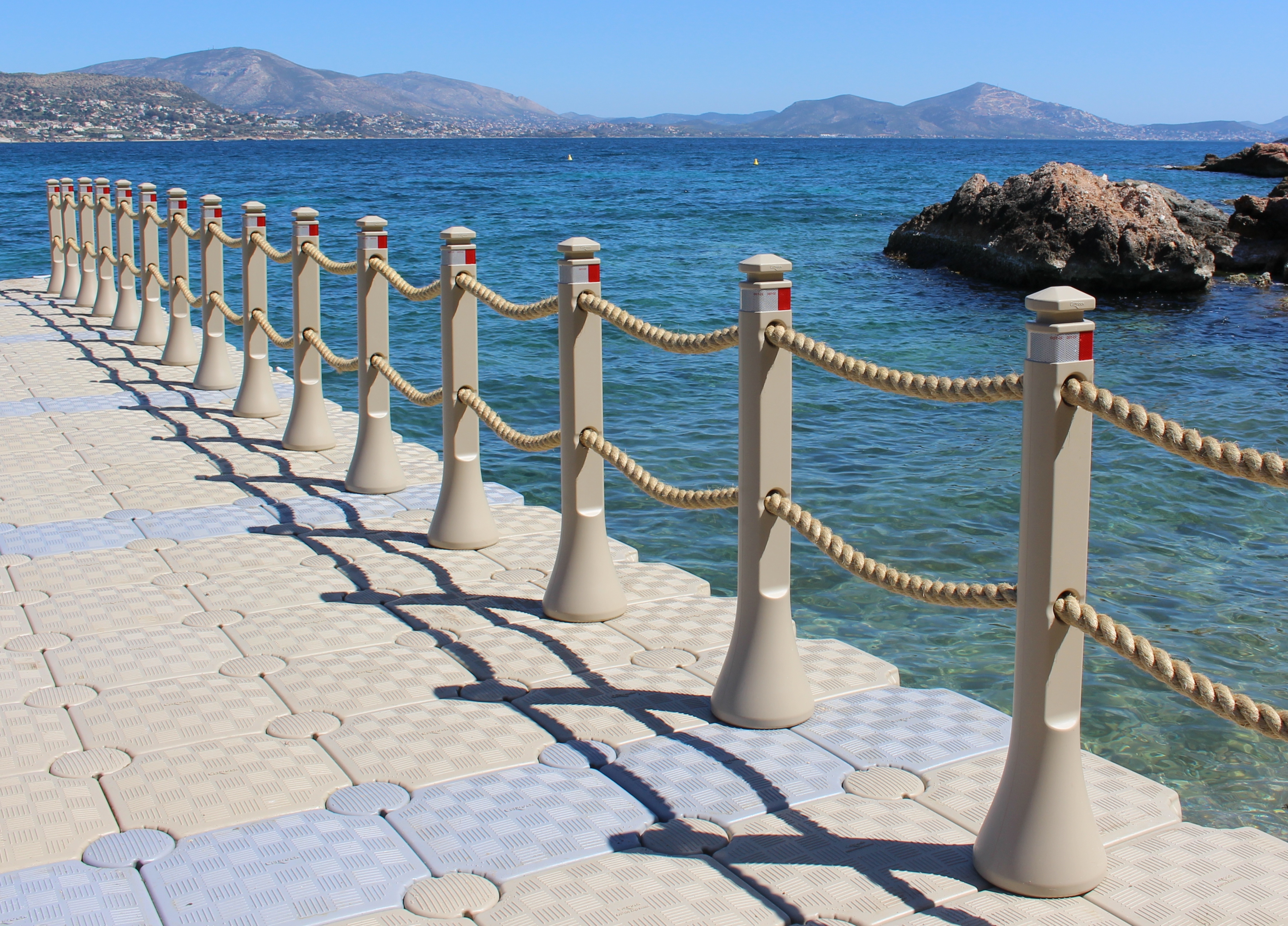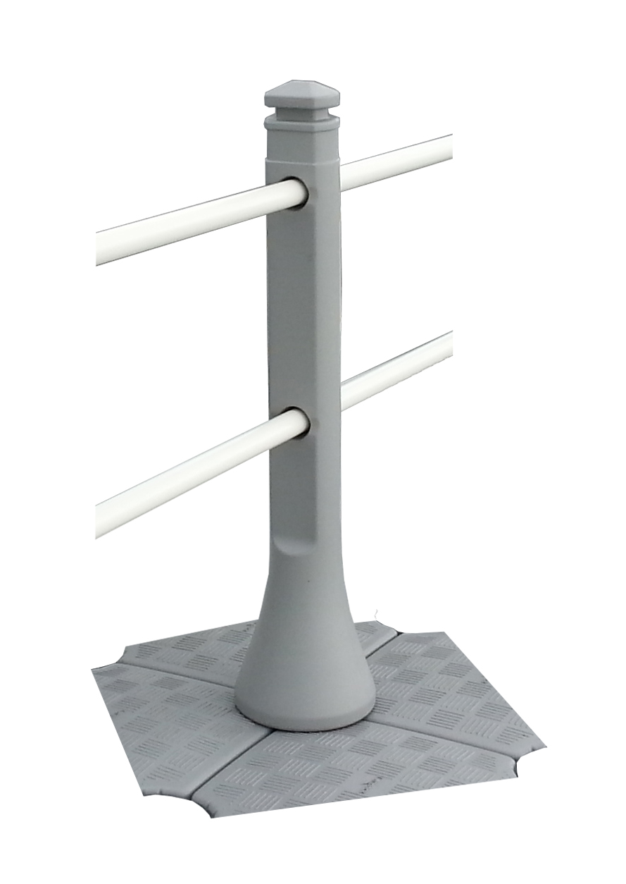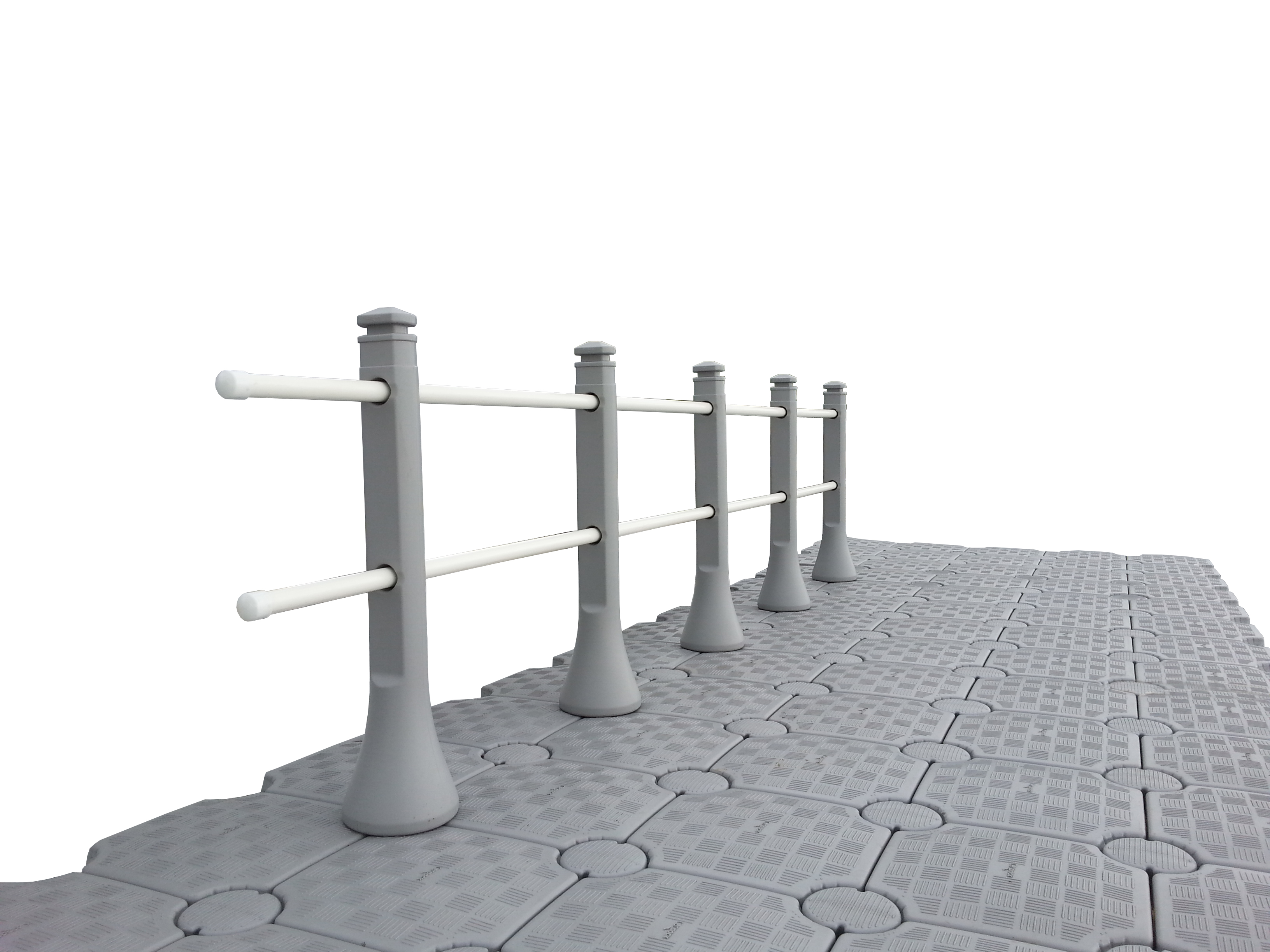 Κιγκλίδωμα τύπου πάσσαλος, πολυαιθυλενίου, το οποίο τοποθετείται στο μέσον και κατά μήκος της πλωτής εξέδρας και προσφέρει ενισχυμένη ασφάλεια και σταθερότητα στο χρήστη. Διαθέτει υποδοχές σε δύο επίπεδα για σχοινένιους χειραγωγούς ή χειραγωγούς από σωλήνες PVC διαμέτρου 40mm.