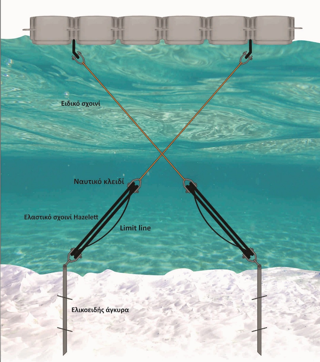 Ειδικό ελαστικό σχοινί αγκυροβολίας Hazelett, Αμερικάνικης προέλευσης, το οποίο υποκαθιστά τη συμβατική αλυσίδα σε ένα κλάδο αγκυροβολίας. Τα συγκεκριμένα ελαστικά σχοινιά ενδείκνυνται για χρήση στην ανοιχτή θάλασσα καθώς απορροφούν πολύ μεγαλύτερη ενέργεια σε σχέση με τις συμβατικές αλυσίδες, επιτυγχάνοντας έτσι καλύτερη συμπεριφορά και αντοχή μίας πλωτής εξέδρας στον κυματισμό. Επιπλέον, δεν διαβρώνονται και έχουν πολύ μικρότερο μήκος και πολύ μεγαλύτερο χρόνο ζωής σε σχέση με τις αλυσίδες.