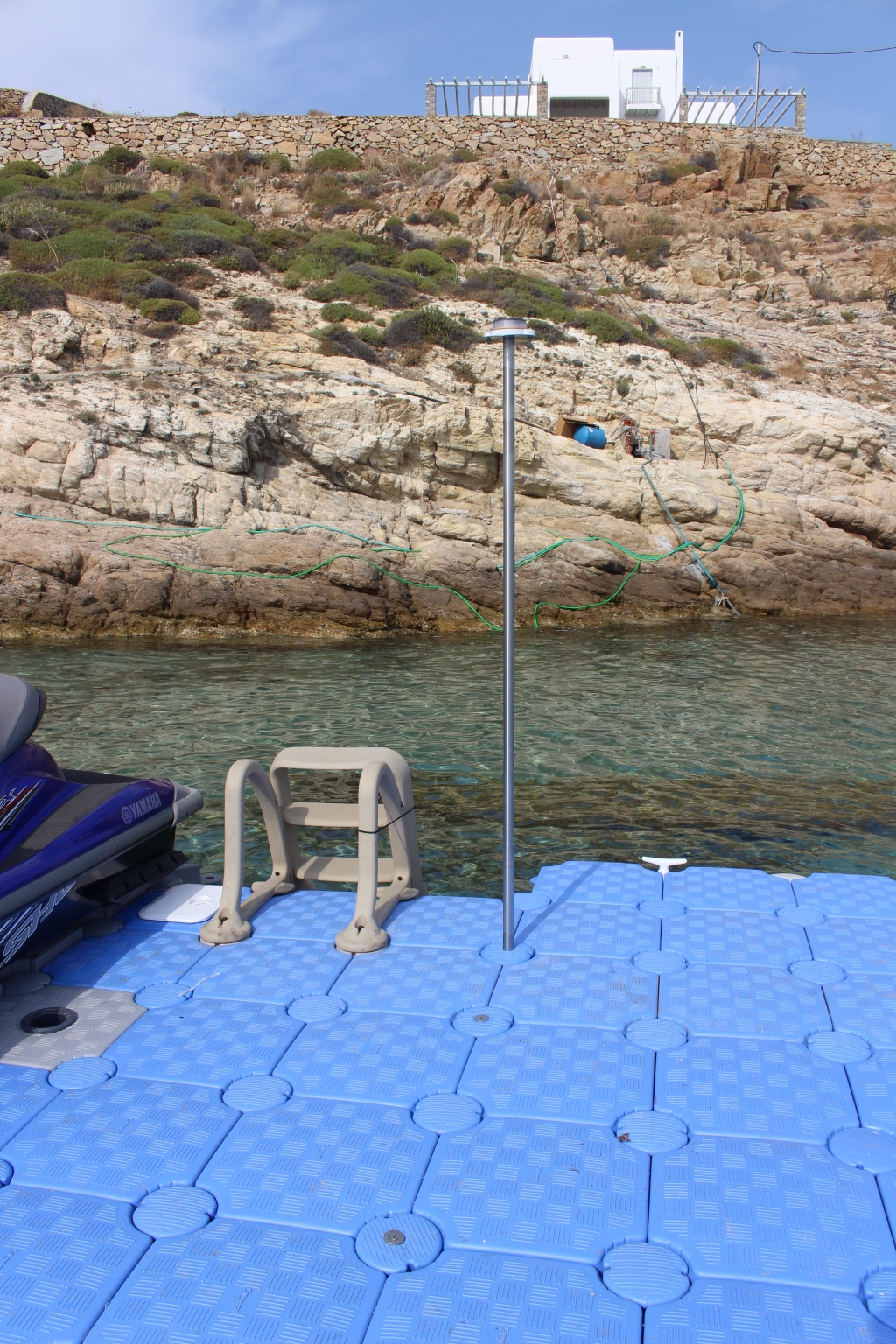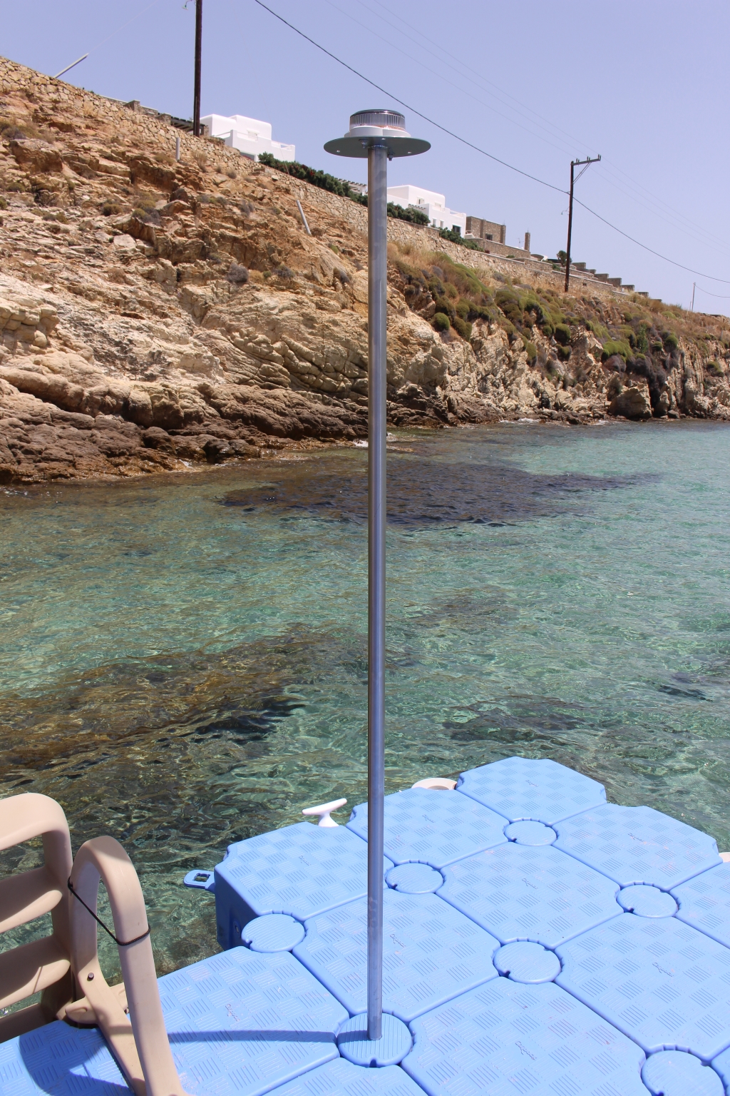 Αδιάβροχος Φανός ασφαλείας (ηλιακός αναλάμποντας) που πληροί τις προϋποθέσεις του ΓΕΝ (Υπηρεσία Φάρων). Ορατότητα 1-3 ναυτικά μίλια, επαναφορτιζόμενες μπαταρίες, βάρος 0,37kg. Συνοδεύεται από ανοξείδωτο ιστό 316 ύψους 1,80m x 3,5cm, με κατάλληλη βάση στήριξης, για τοποθέτηση σε πλωτή εξέδρα.